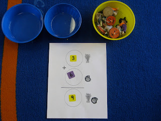 The child then dumps the scarecrows and pumpkins into a 3rd bowl. He/She counts the total number of objects in the 3rd bowl and puts the correct number in the last space.